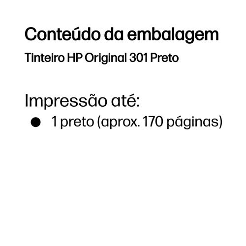 HP Tinteiro Original 301 Preto. Tipo de cartucho: Rendimento padrão, Tipo de tinta preta: Tinta à base de pigmentos, Volume de tinta preta: 3 ml, Tipo de embalagem: Pacote individual, Cor(es) dos cartuchos de impressão: Preto, Quantidade por conjunto: 1 unidade(s), Capacidade de páginas a preto: 170 páginas